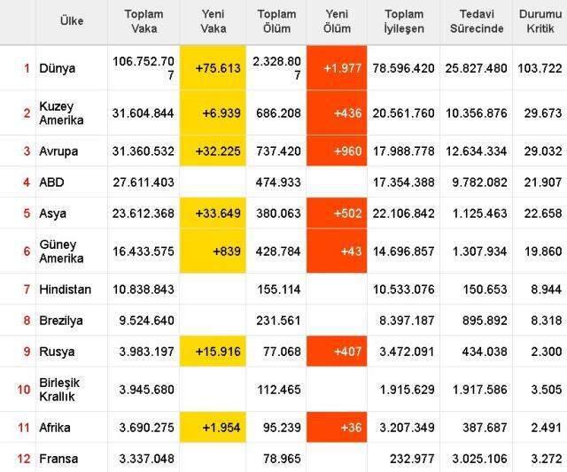 Koronavirüs münasebetiyle dünya genelinde toplam mevt sayısı 2.328.807 olmuştur.