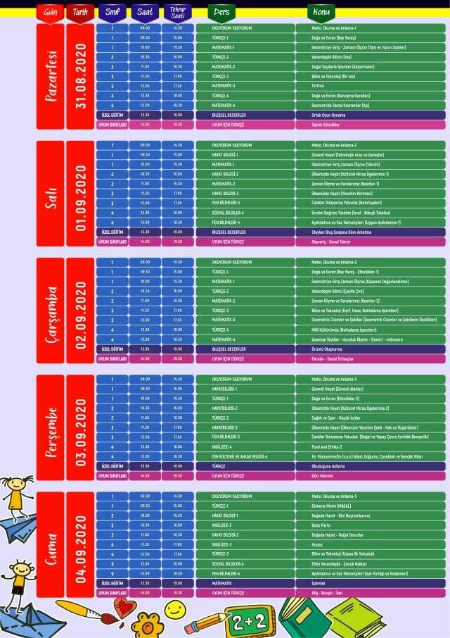 TRT EBA TV kanalları, sınıflara nazaran şöyle: